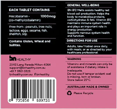BN B12 melts are strawberry-flavoured tablets that dissolve quickly under your tongue. They are a great and simple way to help prevent dietary Vitamin B12 deficiency, delivering 1000mcg of Mecobalamin Vitamin B12 in every tablet.