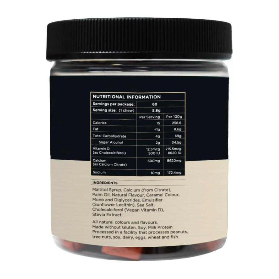 - 500 mg of Calcium Citrate per chew, a highly absorbable form of calcium that supports bone strengthening and healthy digestion