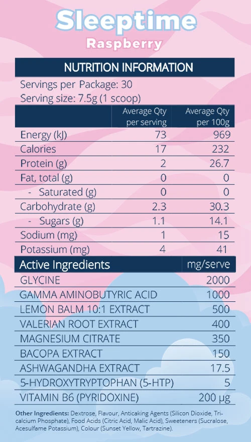 Begin your wind-down routine by mixing one (1) scoop (7.5g) of Sleeptime into 250mL of water 20 – 30 minutes before bedtime. We recommend cold or room temperature water. Stir until fully dissolved and sip away…